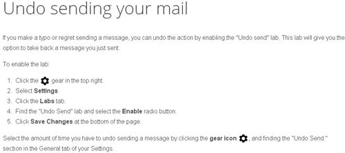 Vâng, Gmail có đấy. Việc bạn làm bây giờ là nhìn phải góc phải của hộp thư. Chọn biểu tượng bánh răng – Settings – Labs – sau đó kéo hết xuống dưới đến khi bạn thấy khung “Undo Send” - bật chế độ này lên. Từ đây về sau, mỗi khi bạn gửi e-mail, bạn sẽ thấy nút “Undo Send” ngay bên trên màn hình trong vài giây, giúp bạn ngăn chặn ngay lập tức những sai lầm có thể gây phiền toái cho mình từ bản e-mail bất cẩn kia.