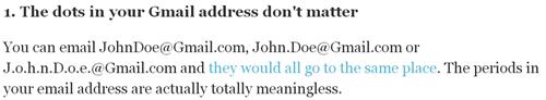 Bạn có biết rằng bạn có thể biến một địa chỉ Gmail nào đó thành cả trăm cái khác nhau? Gmail không nhận diện được dấu chấm và dấu cộng, nhưng bạn có thể sử dụng chúng khi trao đổi địa chỉ e-mail với những người khác. Ví dụ, e-mail của bạn là abcd@gmail.com, bạn có thể đưa cho khách hàng tiềm năng của mình thành ab.cd@gmail.com. Tất nhiên bạn vẫn sẽ nhận được tất cả thư như bình thường nhưng giờ bạn có thể dễ dàng lọc các e-mail đặc biệt đó ra để sử dụng khi cần thiết.