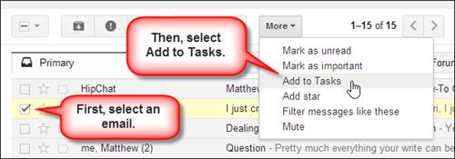 Khi bạn mở thư ra, xổ nút “More” trên thanh công cụ ra, chọn “Add to Tasks”. E-mail này sẽ được thêm vào danh sách những thứ bạn cần làm trong ứng dụng Gmail. Truy cập vào danh sách bằng cách xổ biểu tượng “Gmail” bên góc trái hộp thư và chọn “Tasks”.