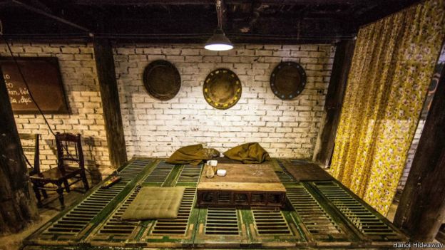 Image copyrightHanoi HideawayImage captionTrưng bày 'cho vui' do những người chủ của Manzi sắp đặtChếch về phía Tây của trung tâm thành phố, một khu dân cư với những khu tập thể xây sau thời thuộc địa là Café Nhà Sàn.