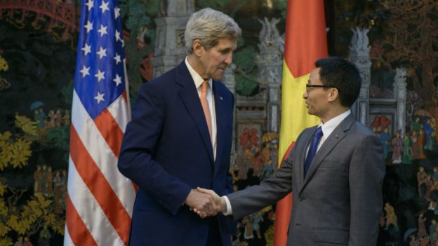 Ngoại trưởng Hoa Kỳ John Kerry và Phó Thủ tướng Vũ Đức Đam trước cuộc họp về Đại học Fulbright hồi tháng 8/2015