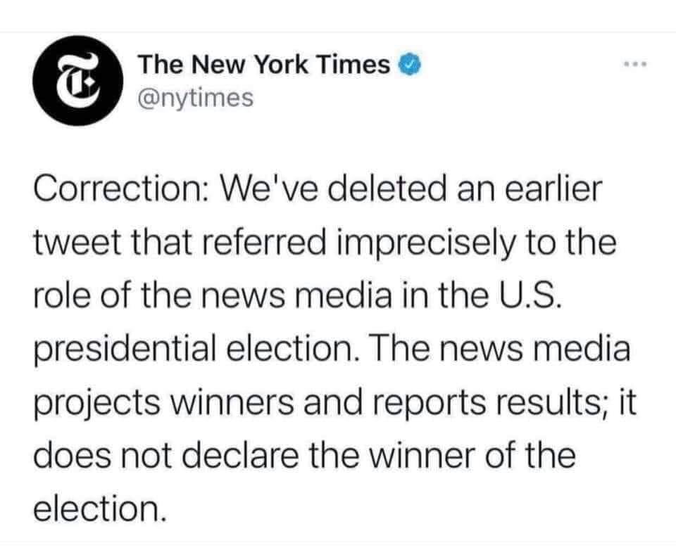 Hàng loạt các hãng truyền thông lớn như CNN, New York Times, Reuters, AP đều tuyên bố ông Joe Biden đắc cử tổng thống và trở thành Tổng thống Mỹ thứ 46 của Hoa Kỳ, nhưng sau đó đã rút lại. New York Times đã xóa tweet tuyên bố người đắc cử tổng thống Mỹ và đăng một bài đính chính lại thông tin như sau:“Đính chính: Chúng tôi đã xoá một tweet trước mà đề cập không chính xác đến vai trò của truyền thông tin tức trong cuộc bầu cử tổng thống Mỹ. Nhiệm vụ của truyền thông tin tức là dự báo người thắng cuộc và báo cáo kết quả chứ không phải là tuyên bố người thắng cử.”